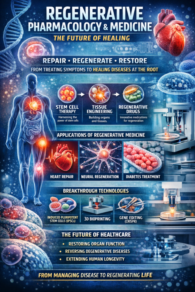In the history of medical science, few intellectual revolutions have transformed our understanding of disease and healing as profoundly as the emergence of regenerative medicine and regenerative pharmacology. Traditional medicine has long focused on controlling symptoms, suppressing disease progression, or replacing damaged organs through surgery or transplantation. However, a new paradigm is rapidly emerging—one that seeks not merely to treat disease but to restore, repair, and regenerate damaged tissues and organs at their biological roots. Regenerative pharmacology and regenerative medicine represent a powerful convergence of molecular biology, pharmacology, biotechnology, stem cell science, and tissue engineering, offering humanity an unprecedented opportunity to rethink the nature of healing itself.