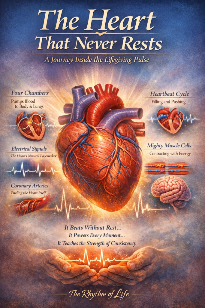 One of the most powerful aspects of the heart is its consistency. It does not take holidays. It does not demand rest. It beats approximately 100,000 times per day and over 35 million times per year. Over an average lifetime, it may beat more than two billion times. With each beat, it sustains life. It sends oxygen to the brain so we can think, to the muscles so we can move, to the kidneys so they can filter, and to every tiny cell so it can perform its function.